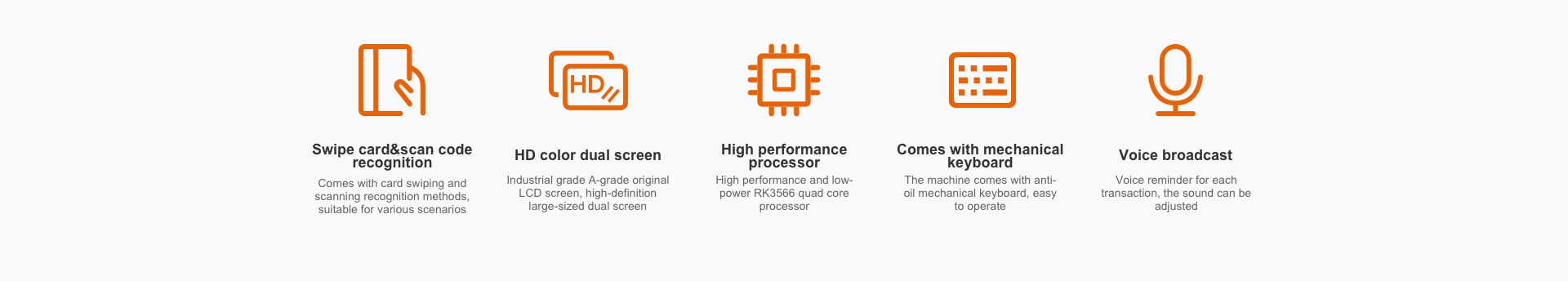 | Screen Display | Operation screen: 4 inch LCD screen (854*480) Guest display screen: 5 inch LCD screen (854*480) |