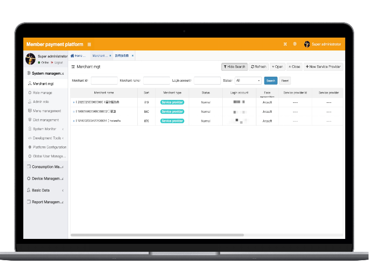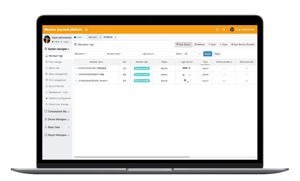 Manage merchants (supermarkets, bars, gyms, etc.) at different levels and in different regions