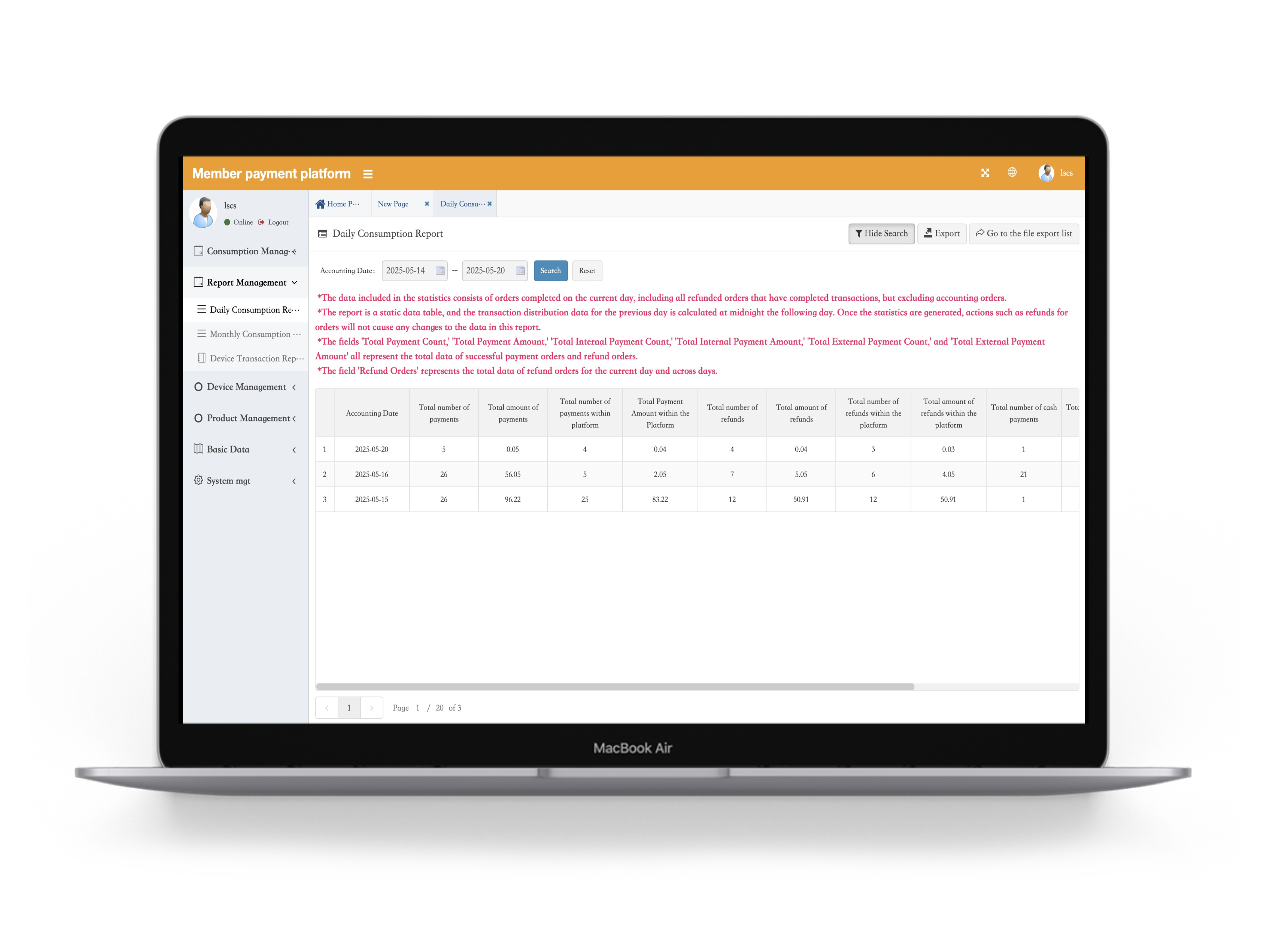 Consumption statistics include daily consumption statistics, monthly consumption statistics and equipment transaction statistics, which can meet the reconciliation needs of different roles