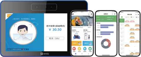 交易记录、设备管理、菜品管理、交易规则、交易分账、财务对账、报表管理、会员管理、门店管理、福利补贴、多收款方…